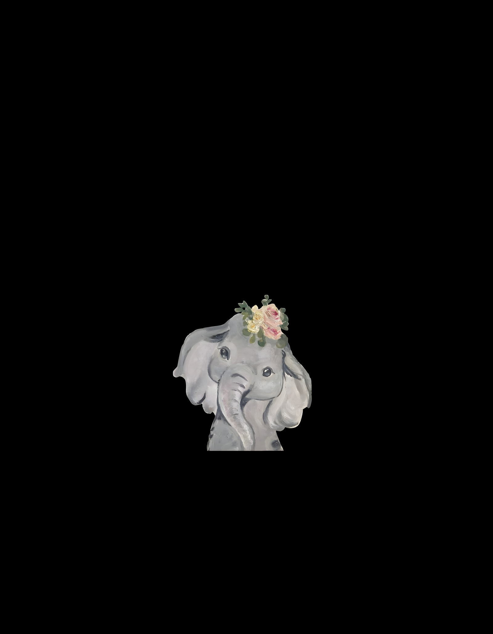 Soft black T-shirt featuring an adorable baby elephant illustration on the back. The elephant is painted in gentle pastel tones with expressive, friendly eyes and a playful pose.