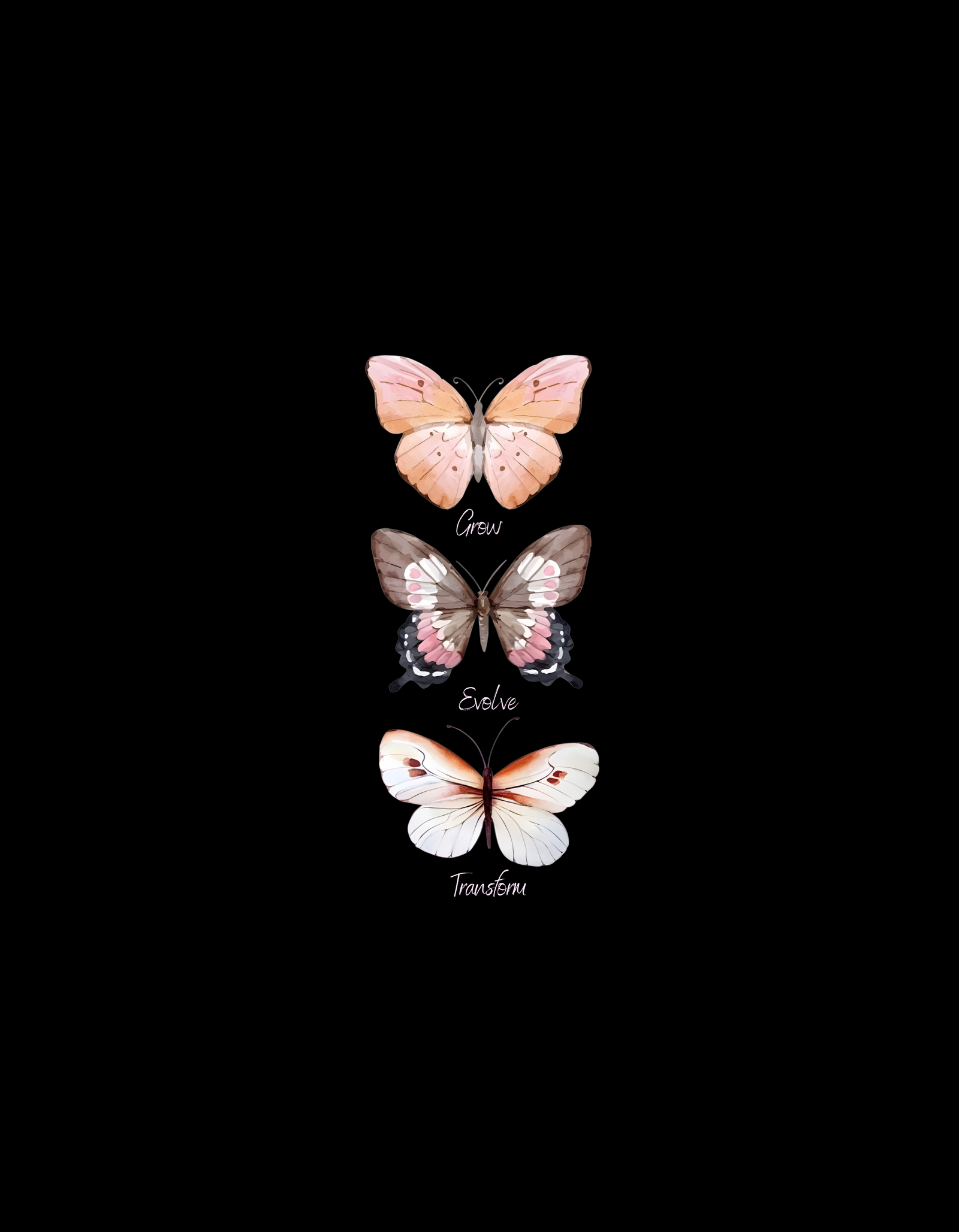 Black T-shirt featuring a beautifully illustrated set of three butterflies arranged vertically on the back. Each butterfly is painted in soft, elegant pastel tones—ranging from peach to brown to white—symbolizing different stages of personal growth.